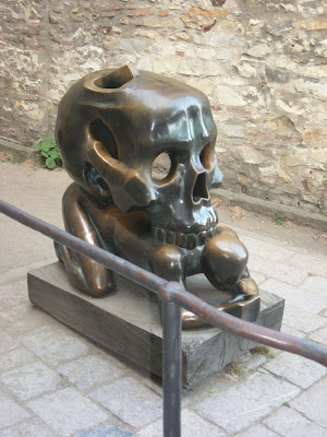 Hoy día, la mayoría de las casitas del Callejón del del Oro están convertidas en tiendas de souvenirs. Al final de la calle bajé por unas escaleras y, cuando salí me dí de bruces con la escultura de un hombre postrado que sostiene, sobre sus espaldas, una calavera